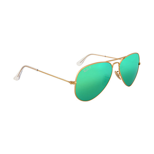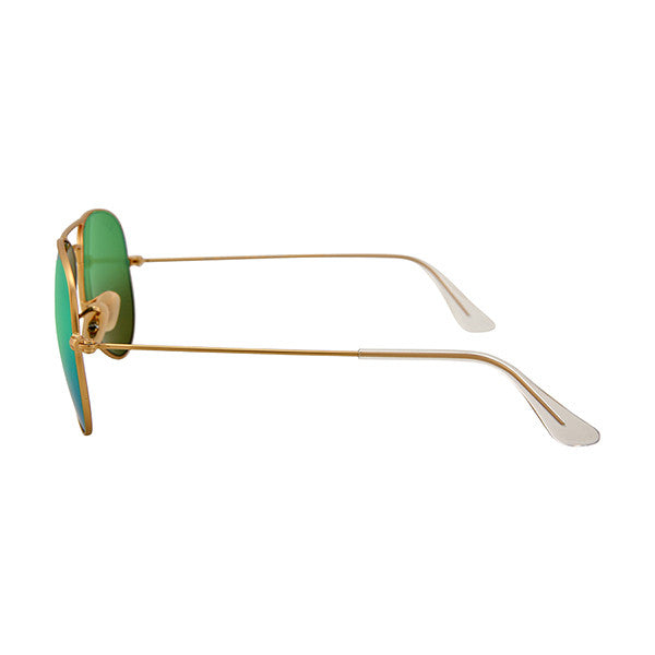 An authentic pair of Ray Ban Aviator sunglasses styled in a gold metal frame with green flash lenses.