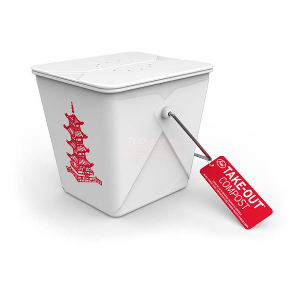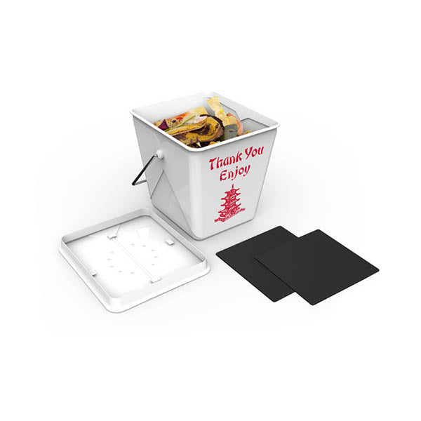 廚餘收納桶,裡面附有兩片黑色活性炭除臭濾心,可放置在蓋子裡面鑲嵌防止不好聞的氣味。結構結實,大小尺吋小而不占檯面空間且廚餘容量大到可裝 3/4 加侖。