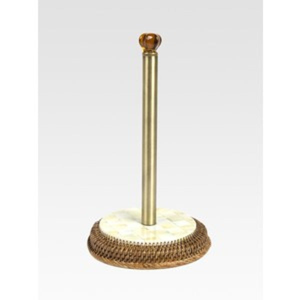An elegant accent for the kitchen, this paper towel holder is handcrafted from sturdy steel with enamel details, and decorated with delicate floral decals. Hand-woven rattan edging and a glass rose finial add a pretty final touch.