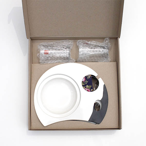 你我都遇過這樣的情況:在社交的場合中一手端著盛好的食物,一手拿著圓潤的酒杯,迎面而來的是準備和你握手交談及交換名片的人,時而有重要來電需要馬上接聽,但手中卻塞滿東西。為了解決這樣的社交窘境,我們決定創造這款能盛裝食物及酒杯的盤子