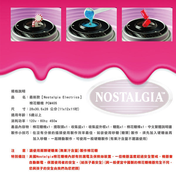 Nostalgia electrics Cotton Candy Maker 棉花糖機,可以製作個人獨特口味的棉花糖,直接放入糖果即可製作,親子全家同樂,與小朋友一起體驗製作過程,棉花糖原料自己挑選,不怕食安問題,安心有保障。