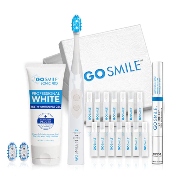 GoSmile Professional 專業牙齒美白組合,包含所有招牌熱賣商品以滿足您口腔清潔與牙齒美白的需求,一天使用兩次我們的藍光聲波震動牙刷與牙齒美白凝膠,改善您的口腔健康並自信微笑;搭配使用隨身牙齒美白筆達到牙齒亮白最佳效果;加上餐後使用牙齒美白去漬擦,清除牙齒表面污漬避免附著以達到牙齒美白最佳效果。