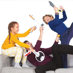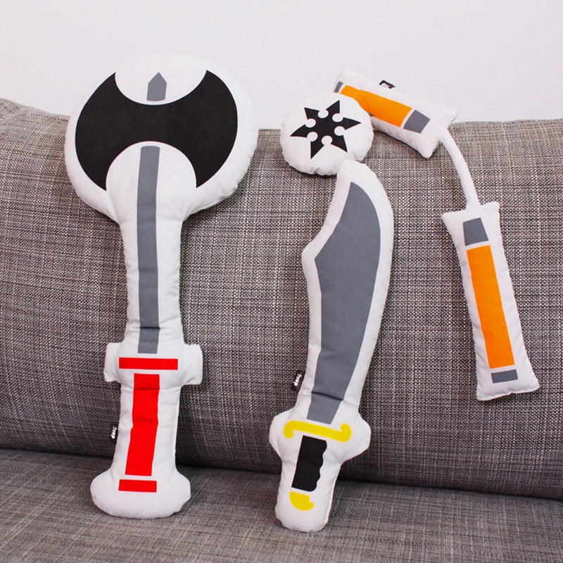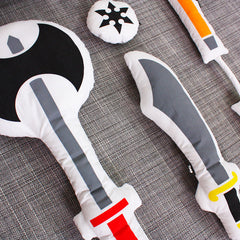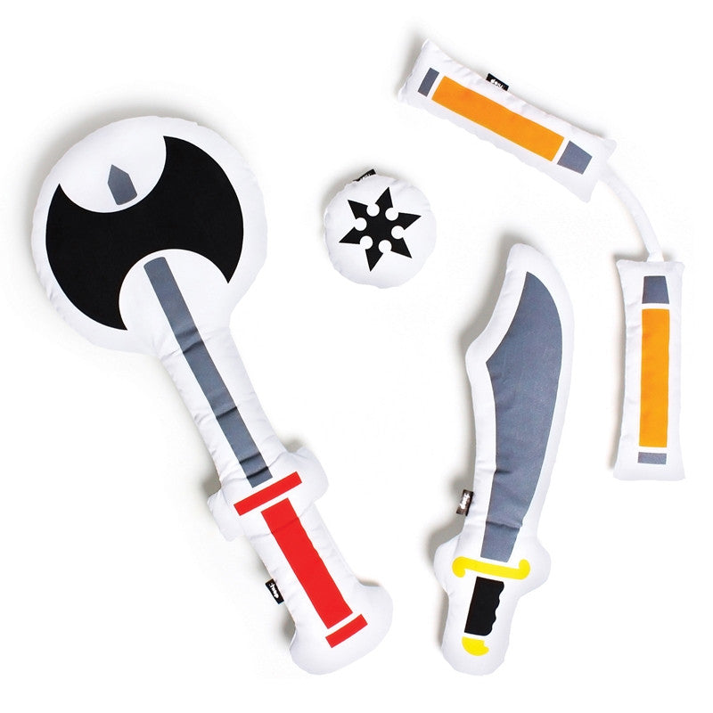 枕頭大戰!! 雙刀斧頭、寶劍、雙節棍和忍者飛鏢,這些枕頭有著各種武器的形狀,柔軟蓬鬆的枕頭攻擊搭配高深莫測的功夫招式,一定會讓你的對手乖乖就範,舉手投降!四款造型枕頭,趣味安全的創新點子!增加親子之間的遊戲互動,同時也訴說著世界和平的美好理念。