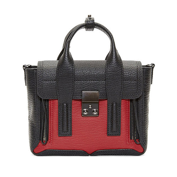 A smaller version of the signature pashli satchel, this structured mini has a square body with edgy gleaming zippers. Featured suede perforated leather, this 3.1 Phillip Lim satchel will take you from board meeting to birthday party, and everything in between.