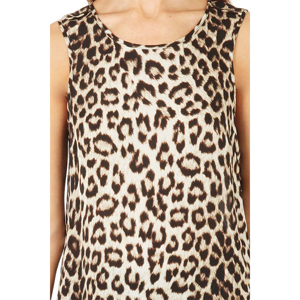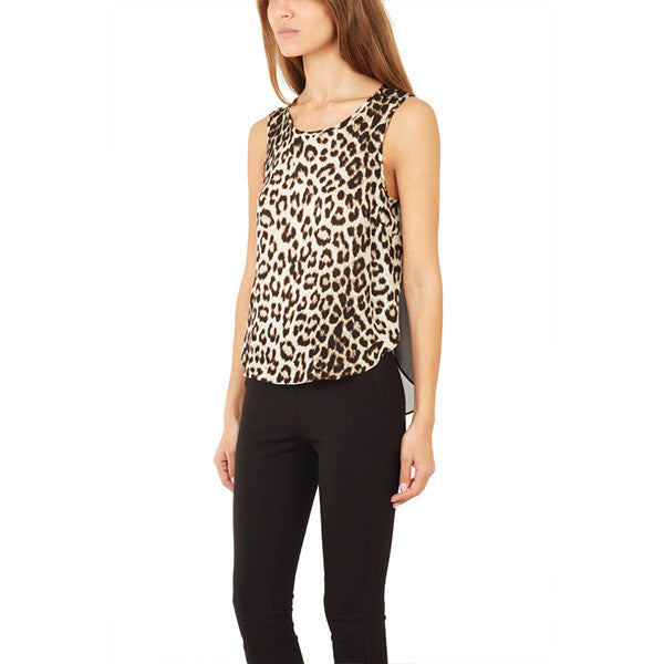 Silk tank blouse in a show-stopping print. A shirt tail hem made from a sheer chiffon creates an open back look. Wear with black skinnies and pumps for a completed look.