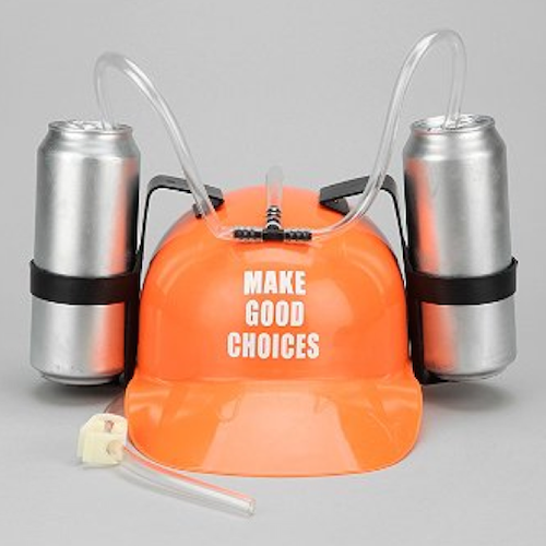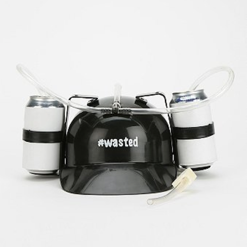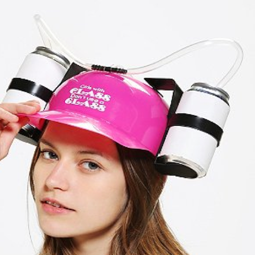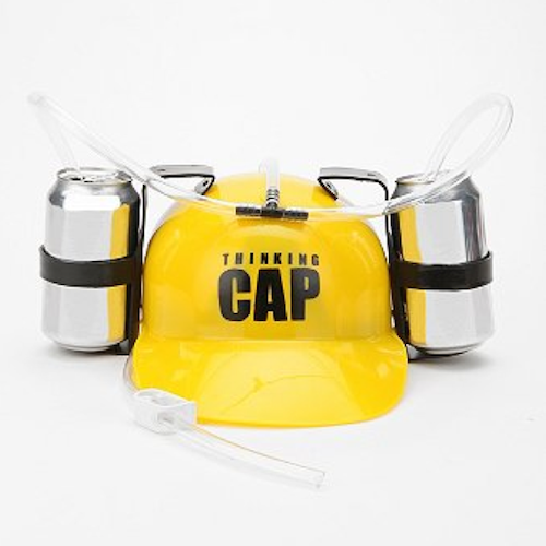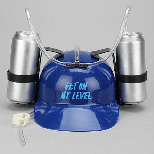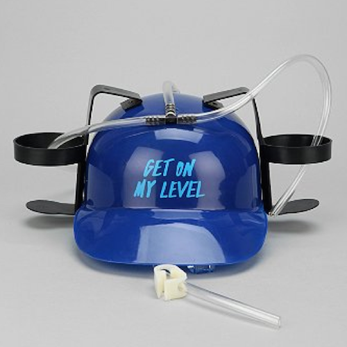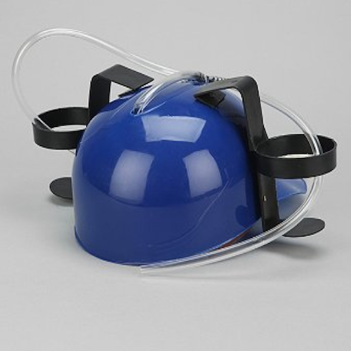 Hey, it's a hard-shell baseball helmet turned drinking apparatus! Simply slip in your drink of choice and drink away, hands free! Comes complete with an attached clamp to prevent unfortunate spilling + an adjustable strap for a perfect, secure fit.