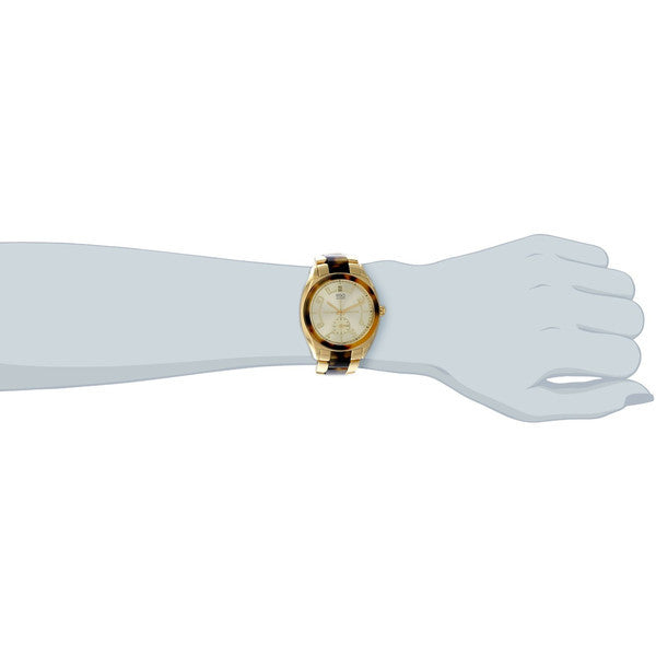 Gold-tone stainless steel case with a gold-tone stainless steel and totoise-tone acetate bracelet. Fixed tortoise bezel. Gold-tone dial with gold-tone hands and index and Arabic numeral hour markers. Index markers mark the 3, 6 and 9 o'clock positions. minute markers around the outer rim. Dial Type: Analog. Date display at the 12 o'clock position. Small seconds sub-dial at the 6 o'clock position. Quartz movement. Scratch resistant mineral crystal. Solid case back. Case diameter: 36 mm. Tonneau case shape. Deployment clasp. Water resistant at 30 meters / 100 feet. Functions: date, hour, minute, small second. Dress watch style. ESQ Origin Gold-tone Dial Gold-tone Steel Tortoise Acetate Ladies Watch 07101426.