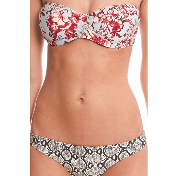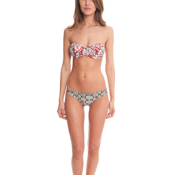 Fun printed floral sculpted bra top with mis matching low rise snake skin printed bottom by Zimmerman. Underwire top with optional straps.