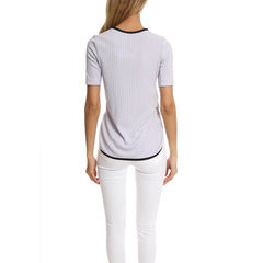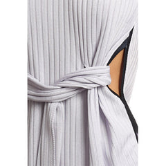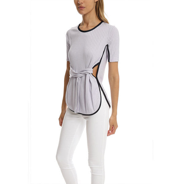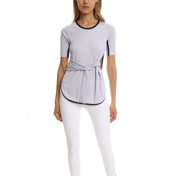 Both casual and sophisticated, this ribbed short sleeve top is a subtle statement piece. A side slit shows a little skin, brought in by a tie belted waist. The slightly elongated bibbed hem plays with proportion, as do the elbow length sleeves, creating a sleek silhouette.