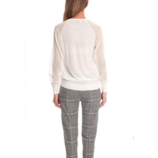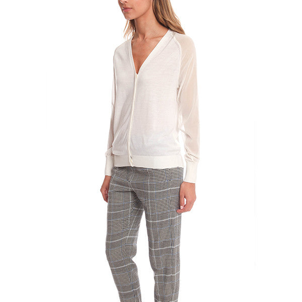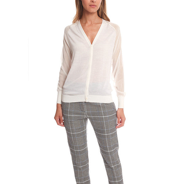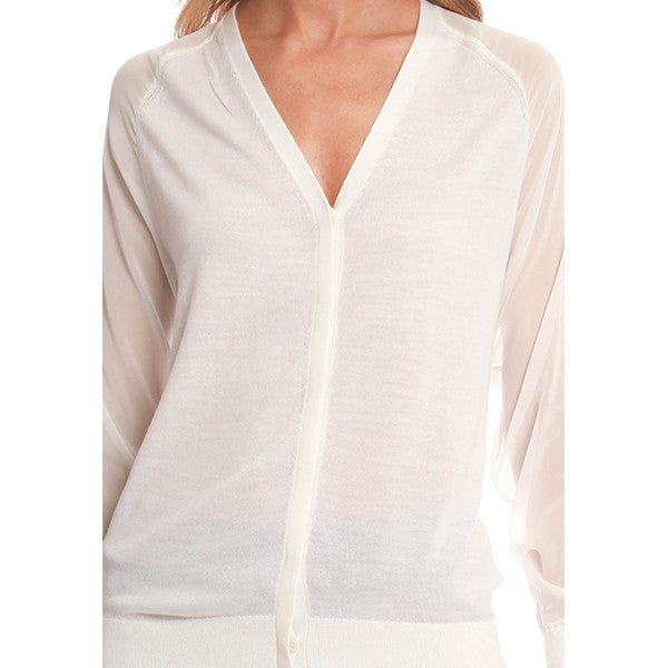 Cozy wool cardigan with contrasting silk sleeves and a hidden placket.