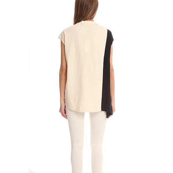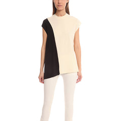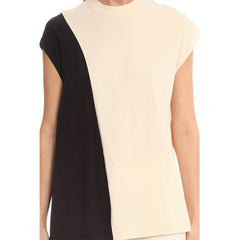 A horizontal colorblocked side drape top from 3.1 Phillip Lim featuring a mock neck and sleeveless design.