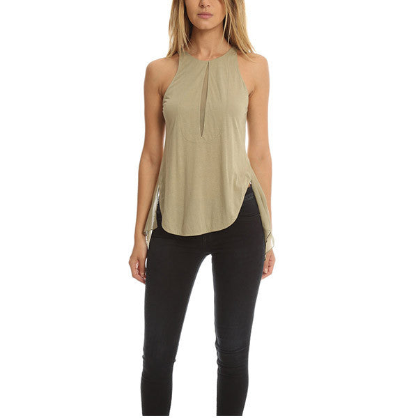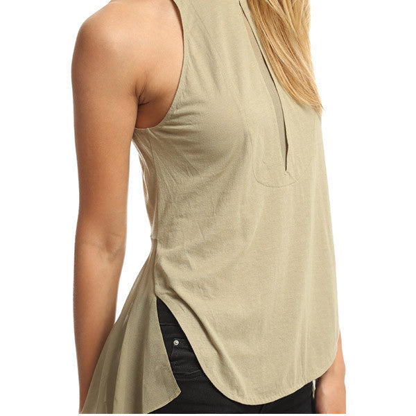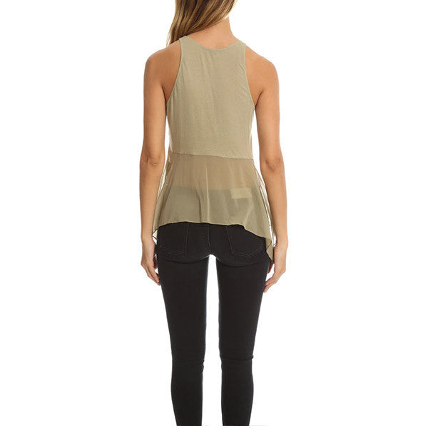 A shirttail hem with chiffon fishtail extension in the back gives this modified racerback a light and feminine flavor. Chiffon keyhole detail in the front plays up the flirt factor.