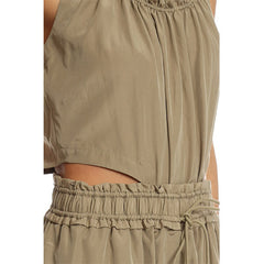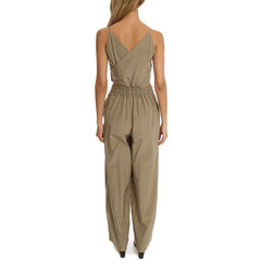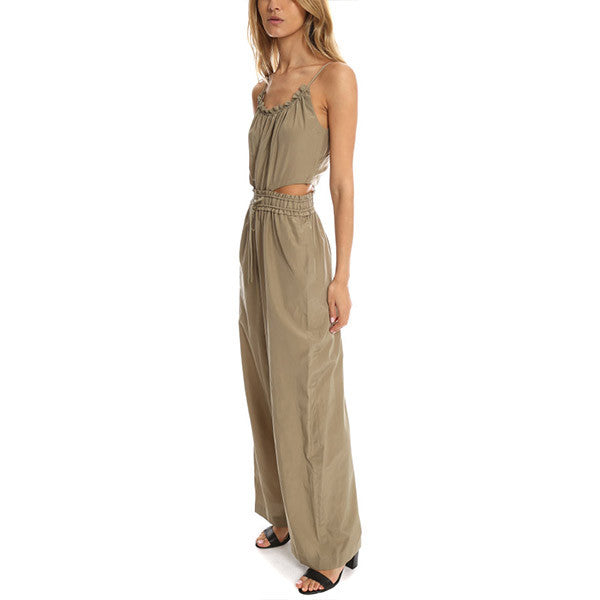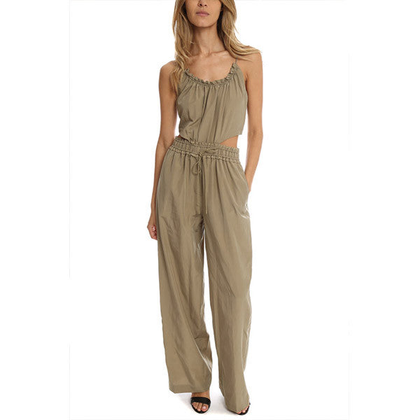 A shirred drawstring waist plays off the gathered neckline and wide leg pants contrast the super delicate straps. The bold silhouette is softened by cut-out detail along the sides for a chic and feminine look.