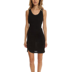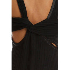 A twisted band knots at the back of this ribbed scoop neck dress for just a touch of drama. A bibbed hem and contrast stitching bring a casual element for a design that can be dressed up or down.