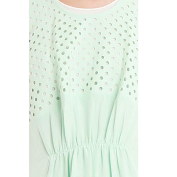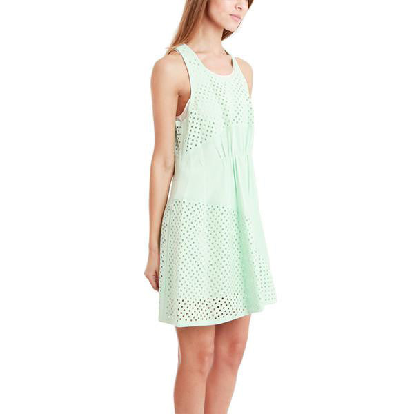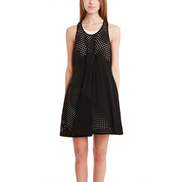 Not your average sundress, this racerback comes with perforated asymmetrical areas which combined with the white lining give off a fun polka dot effect. Gently gathered in the front perfect for day or night.