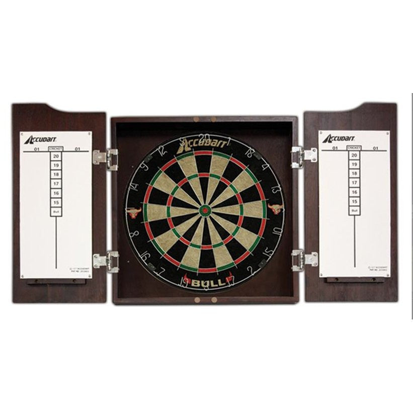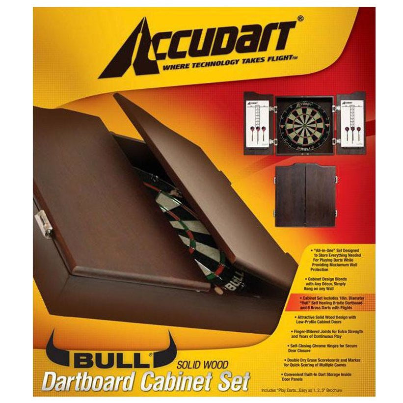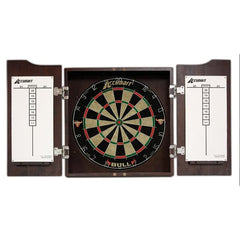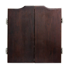Wood Veneer Cabinet Set. Includes Bull Bristle Dartboard And 6 Quality Brass Darts. Attractive Wood Design With High Profile Cabinet Doors. Finger Mitered Joints For Extra Strength And Year Of Play. Self Closing Hinges With Antique Brass Finish. Double Dry Erase Scoreboards And Markers For Easy Scoring. Convenient Built In Dart Storage Inside Door Panels. Includes Play Darts Easy As 1,2,3 Brochure.