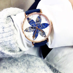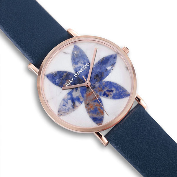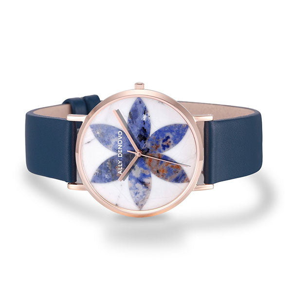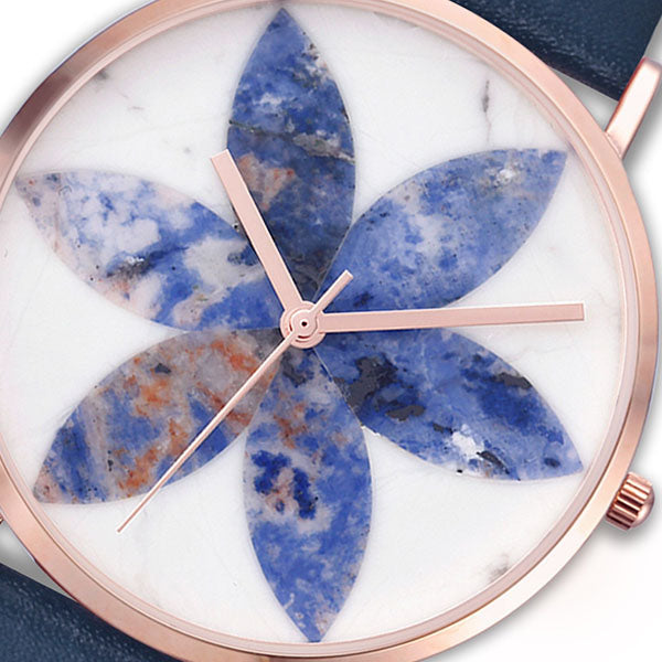 挑戰高難度雙色大理石手工拼製工藝,手工挑選天然海藍色大理石拼接出具有漸層動感的花樣,36 mm 亮澤玫瑰金的錶殼搭配優雅的海軍藍色真皮錶帶。低調奢華的風格,可日常穿戴也適合華麗正式的場合。
