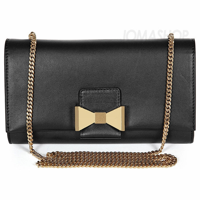 Smooth black lambskin leather "Bobbie" wallet with gold-tone hardware and chain.
