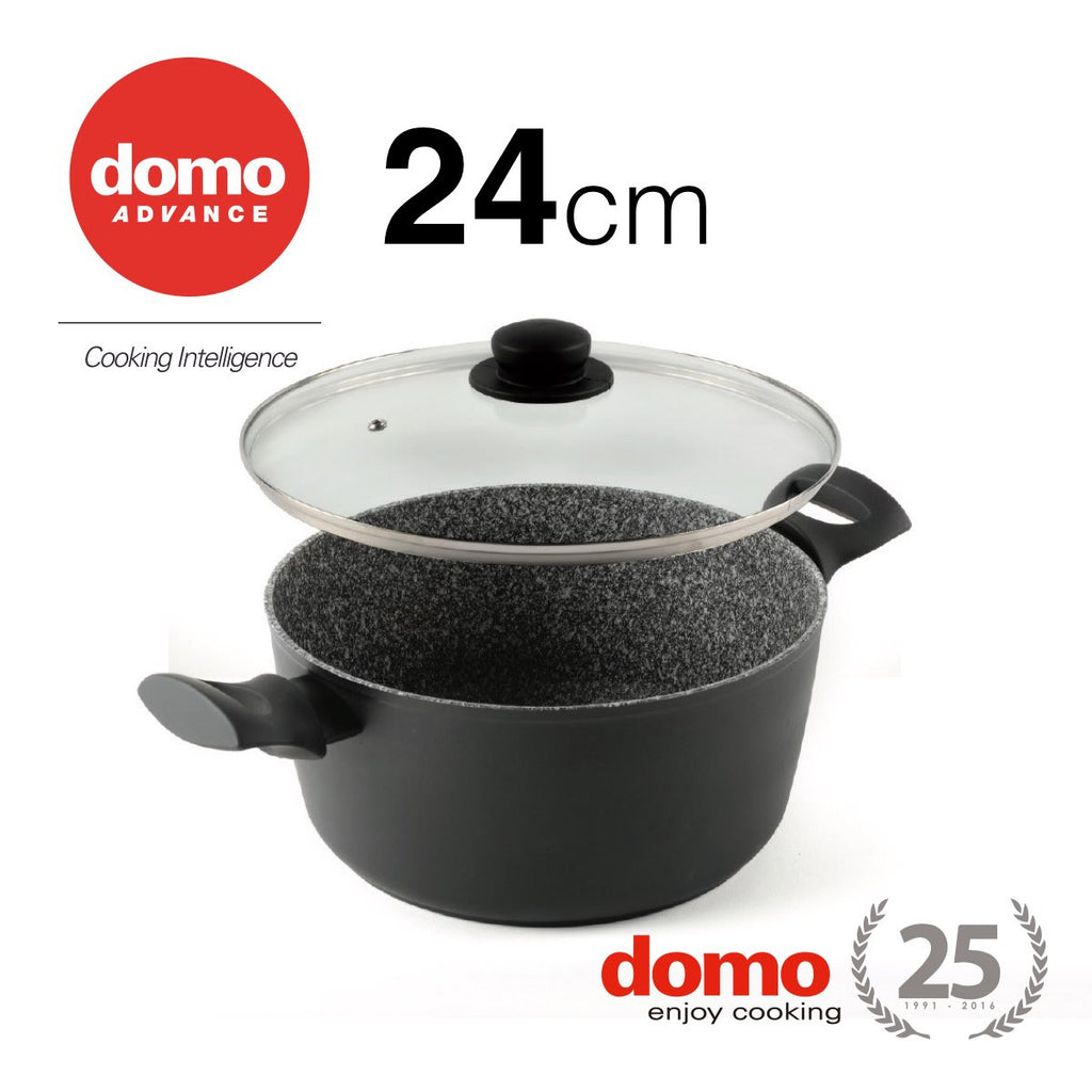 Domo Dutch Oven神盾礦石雙耳附蓋湯鍋,內嵌專利節能導熱板,導熱速度順暢、鍋身適用全種類爐面、不含鉛鎘、PFOA等任何有毒物、耐磨Hoplon塗層,可使用金屬器具正常操作、航太科技Hoplon不沾塗層,較一般傳統塗層壽命高兩倍、不沾塗層可保留食材原味及結構、鍋身可承受400度高溫,且可耐高溫瞬間至冰凍的溫度變化、清洗便利,亦適用於洗碗機。