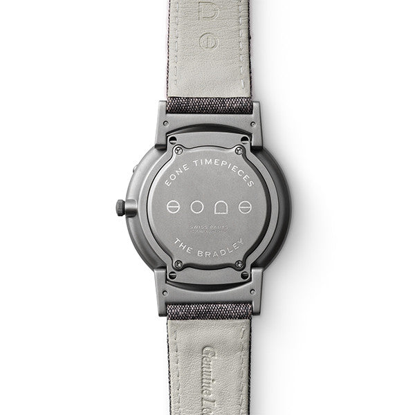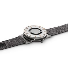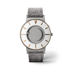 The Bradley Compass 的簡約設計在錶面上標記出每一格時間。為了增加觸感的易讀性,特地在 12 時的位置換上了一個三角標記,及在 3 時、6 時及 9 時設了較長的標記。錶面上的鋼珠表示小時,側面的鋼珠表示分鐘。