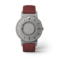 The Bradley Compass 的簡約設計在錶面上標記出每一格時間。為了增加觸感的易讀性,特地在 12 時的位置換上了一個三角標記,及在 3 時、6 時及 9 時設了較長的標記。錶面上的鋼珠表示分鐘,側面的鋼珠表示小時。
