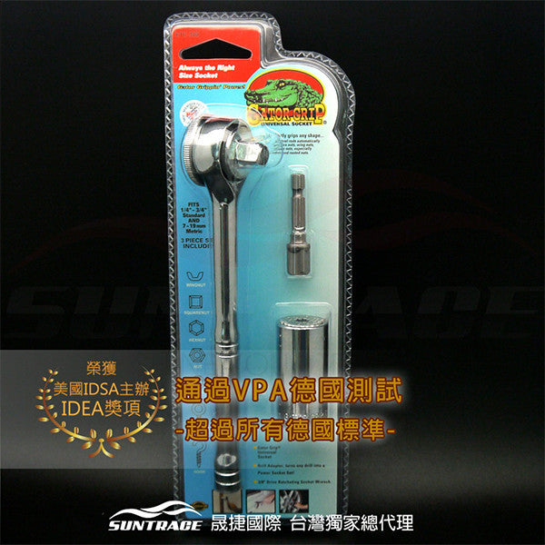 Gator Grip 萬用套筒可承接適用於直徑介在 7 至 19 公厘(mm) 內的非圓形外緣緊固件與螺絲頭、最大可耐受的扭轉力矩為 250 牛頓 - 米 (N.m)