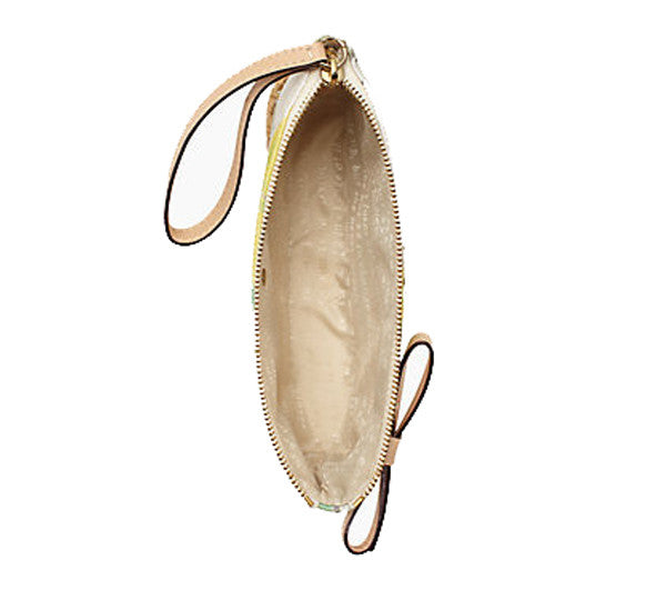 Filled with things to love this adorable wristlet is featured in smooth leather trim, a convenient wrist strap, zip top closure, 14- karat light gold plated hardware, custom woven quick, curious lining, and the scene of painted lemons that adds the citrus and chic touch to any day of dress up.