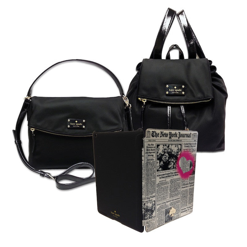 So you are heading out the door there are no more perfect styles to grab to go out with then this grouping we have put together which includes the nylon little minka, patten backpack, and the iPad folio featured in the new york journal print. All of these styles are functional and fun to carry, the Kate Spade nylon is lighter in weight and is durable.