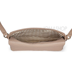 "Affogato" soft pebbled leather crossbody with 14kt light gold-plated hardware and custom woven bookstripe print on poly twill lining.