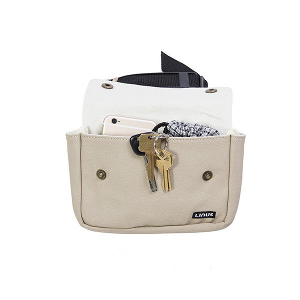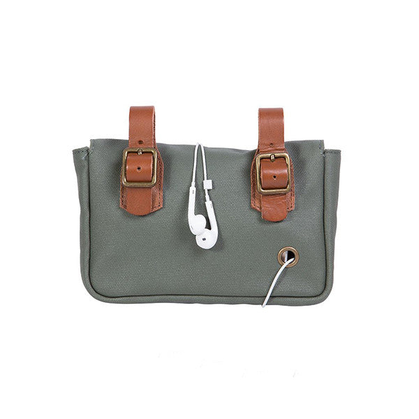 我們希望設計一款小而輕巧的包款,不只能夠放置在自行車上也可以當成腰包使用,您可放置鑰匙、錢包、智慧型手機,我們更貼心的在包款背面配置了耳機孔,採用了油蠟帆布增添防潑水效果、搭配黃銅扣環及皮革配件質感加倍。