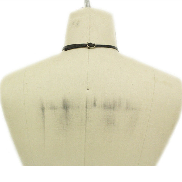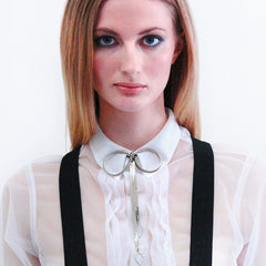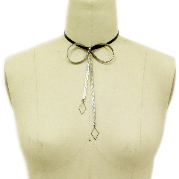 The perfect accessory for this seasons looks. A beautiful snake chain bow tie with an adjustable leather strap in back and diamond charm detail. One size. Handmade in USA.