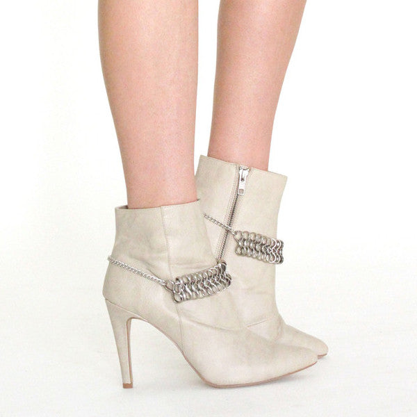 This new style of shoe jewelry has the edge and the uniqueness of The Spine Harness but now, for your favorite pair of shoes! This pair can fit around just about every pair of boots or loosely over the ankle with a hot pair of heels. Adjustable (clasps to size). One size. Comes as a pair. Made of iron and brass. Made in the USA.