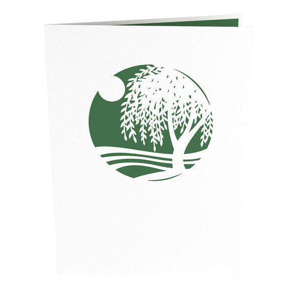純白色的封面將月亮及柳樹的圖騰映襯的更富有詩意。打開卡片後,是雕琢細緻的立體柳樹,柳樹下是一對戀人依偎在小橋上欣賞著細水長流,非常適合想要含蓄表達情意的您。