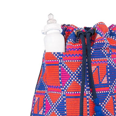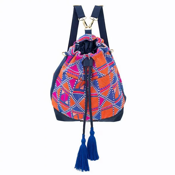 外層刺繡與束口繩流蘇裝飾部分使用棉與聚酯纖維混紡的高級繡線,無防水處理