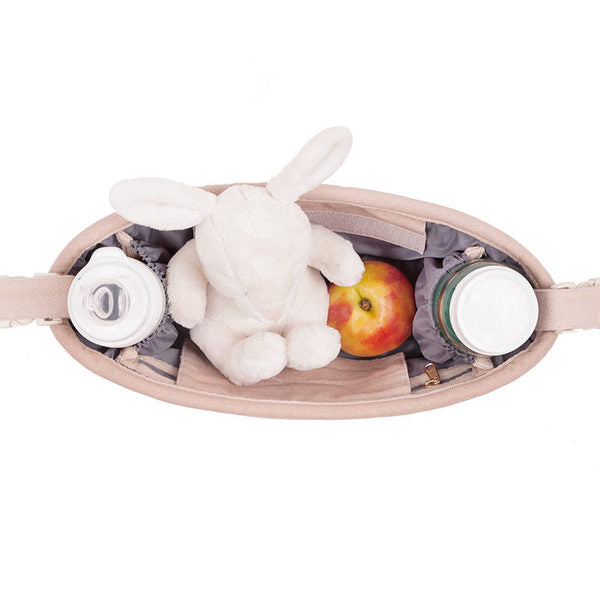兩側的鬆緊固定帶能輕鬆收納奶瓶、水壺、食物罐等需要直立的物品,內側拉鍊小口袋能收納鑰匙零錢或車票等容易散落的小物
