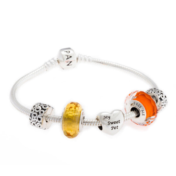 Description: Celebrate the love, loyalty, and playfulness that pets bring to our lives. This bracelet features 2 S Clips, 1“Fascinating Orange (Murano), 1 Fascinating Ochre (Gold Colored Murano), and 1 My Sweet Pet with Paw Prints (Double Sided) on a classic PANDORA bracelet. This item has, 1 x 590702HV, 1 x 791629, 1 x 791262, 1 x 791626 and 2 x 790338 6.1".
