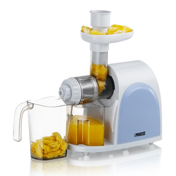 PRINCESS 健康蔬果慢磨機,操作方便,清洗容易,無刀片設計,使用安全,汁渣分離,出汁率達 86% 以上,低速榨汁,有效保存食材營養與風味,反推進裝置,防止食材阻塞,主機備有防過熱機制,使用起來安心又方便,附專用清洗刷,贈獨家研發食譜。讓您隨時享受美味、健康、好喝的蔬果汁。