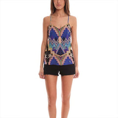 A loose fitting silky camisole top with a colorful night time pyramid print.