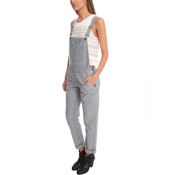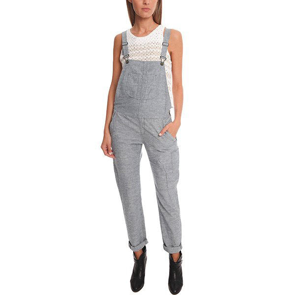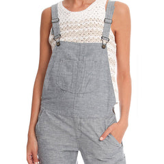 A lightweight chambray overall features adjustable straps, slit pockets at the hip and a soft cotton feel.