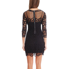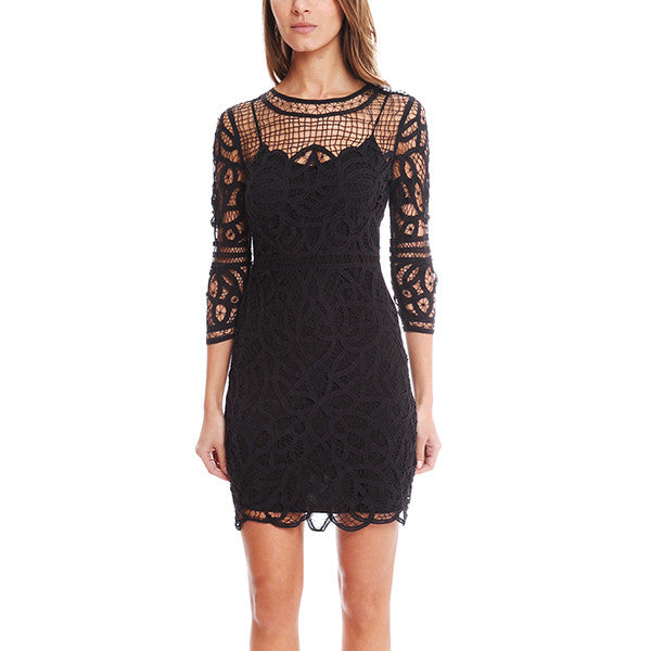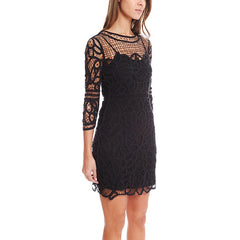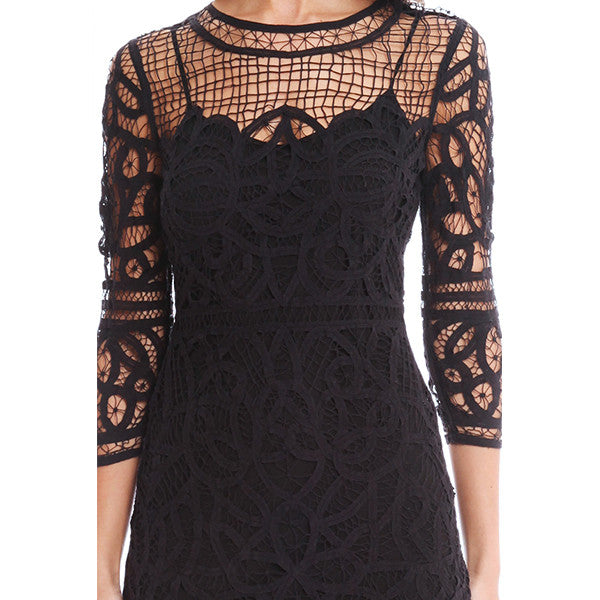 A beautiful crochet design over a tank slip. Crewneck style with 3/4 sleeves and an exposed back zipper. A sexy nighttime look that can be completed with heels.