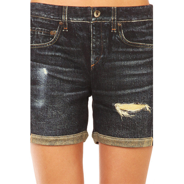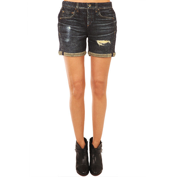 This printed soft terry short creates a denim look on a slightly oversized fit. A worn in look with five pocket styling makes it a great short to wear with boots and a button down.