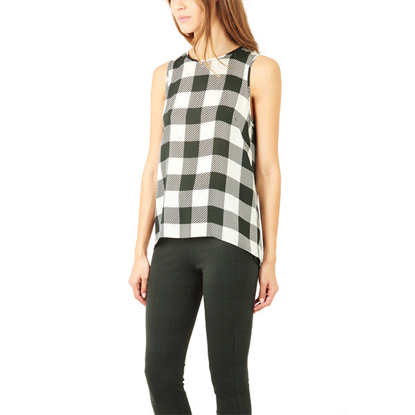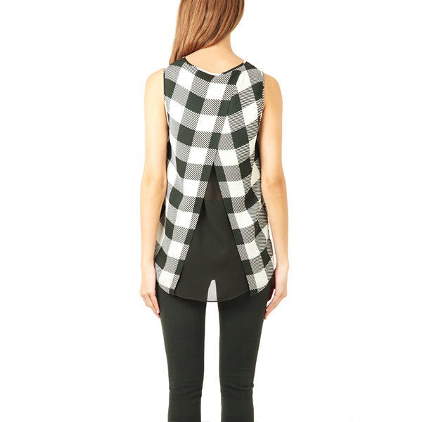 With flawless craftsmanship, Rag & Bone has unleashed this style must have! In an on trend plaid print, this tank surprises with an open slit back covered by a sheer layer. Dress this up with leather skinnies and heels for a night out.