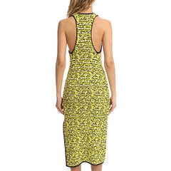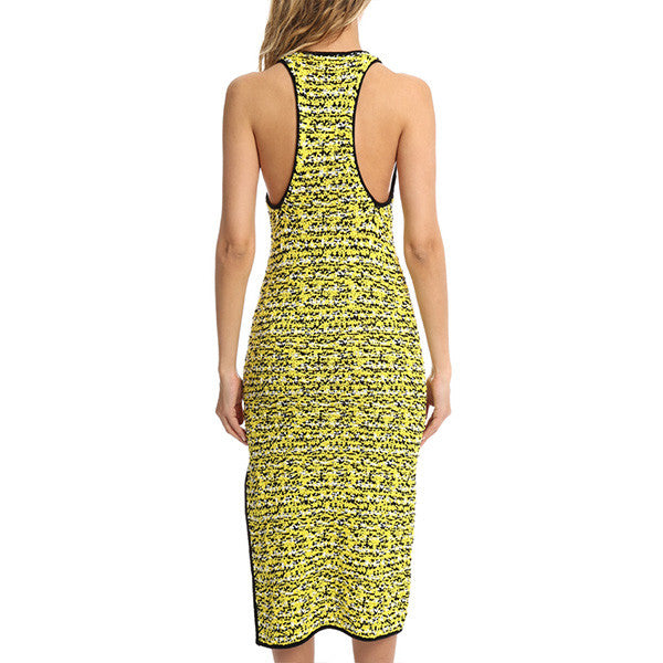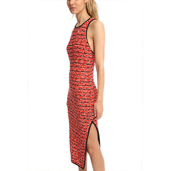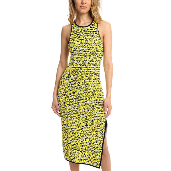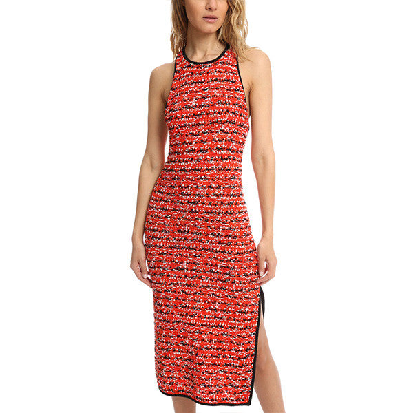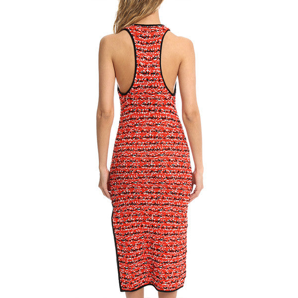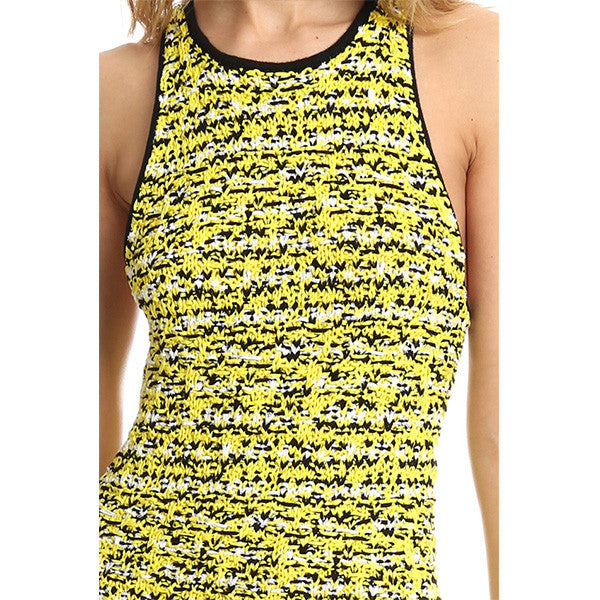 Texture, texture, texture! Chunky knit give tons of texture to the lightweight fabric. Racerback with crewneck and unfinished sateen trim add a fun and sporty appeal and a side slit adds movement to this form fitting below the knee dress.