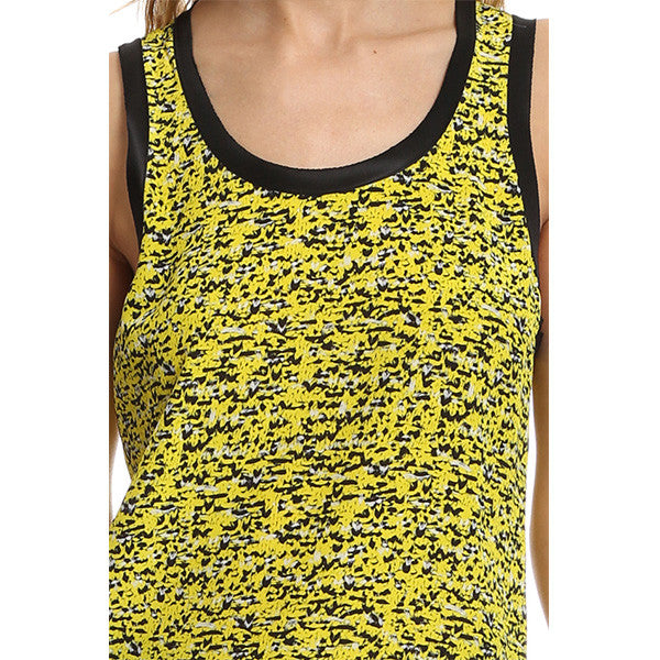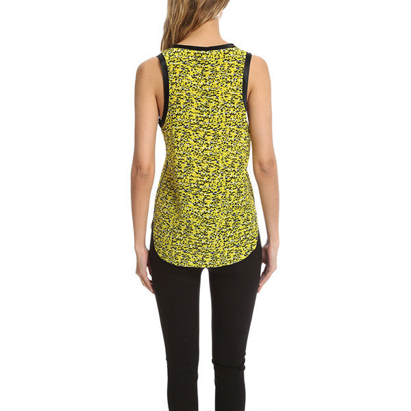 Highly textural silk tank adds a playful pop of color to your look. Flecked pattern give the illusion of tweed, and the unfinished sateen trim along the neckline and arm holes adds even more texture to this bright lightweight tank.