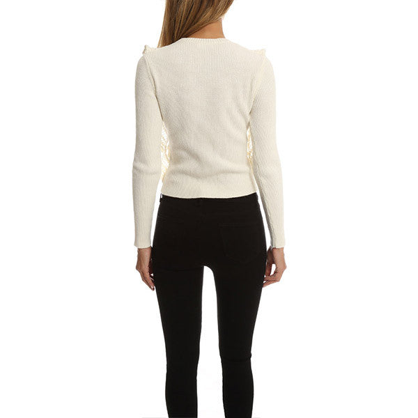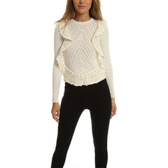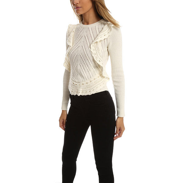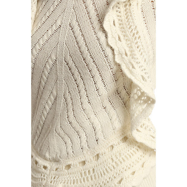 This highly embellished knit sweater brings a feminine frill to a classic cable knit. The ornamental knitting creates a lace effect which flutters from shoulder to hem.