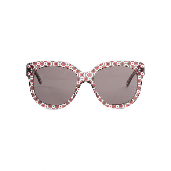 Stella McCartney transparent frames featuring brown circular pattern in a cat eye silhouette. Beautiful, intricate pattern makes them perfect to add to your shade collection!