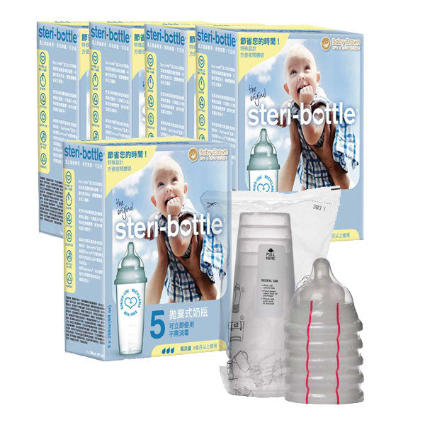 Steri-bottle® 是歐美暢銷的全拋棄奶瓶,從盒子裡取出馬上就能使用,100% 可回收。Steri-bottle® 每一盒裝有奶瓶及奶嘴,由完全不含雙酚 A 及鄰苯二甲酸酯的塑膠材質製成。