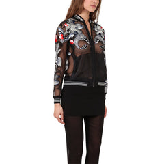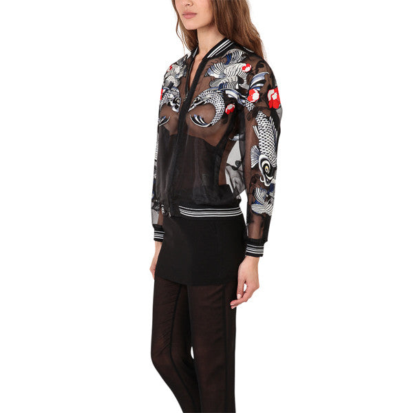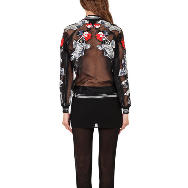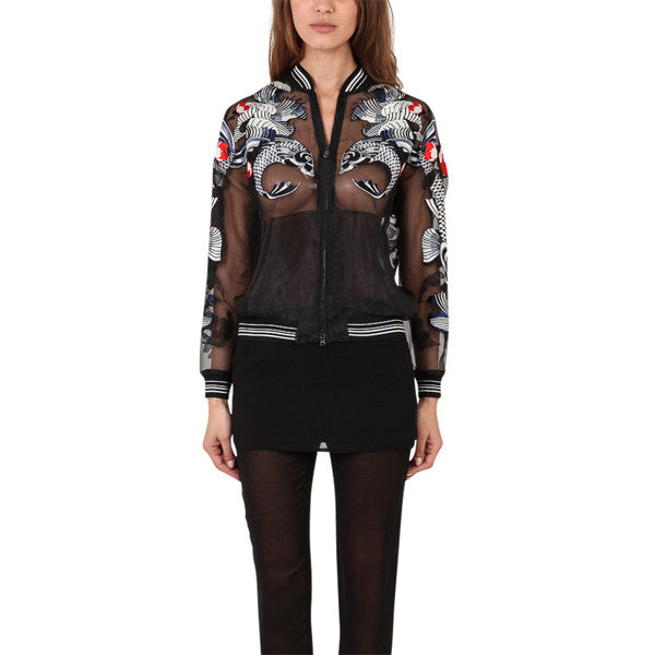 Beautiful sheer organza panels amongst a shimmering delicate jacquard embroidery, decorate this striking jacket inspired by Japanese tattoo art. Ribbed trim and zip details add to its modern fit.