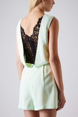 Tall minty playsuit with back lace detail and zip fastening. 100% Polyester. Machine washable.